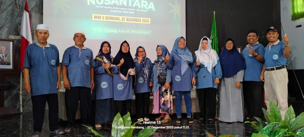 REMBANG – Aula MAN 2 Rembang menjadi saksi sejarah berkumpulnya ratusan alumni dari berbagai penjuru Nusantara dalam acara bertajuk “Reuni Nusantara”. Kegiatan ini menyatukan lintas generasi mulai dari era PGAN Lasem, MAN Lasem, hingga MAN 2 Rembang pada Sabtu, 27/12/2025.