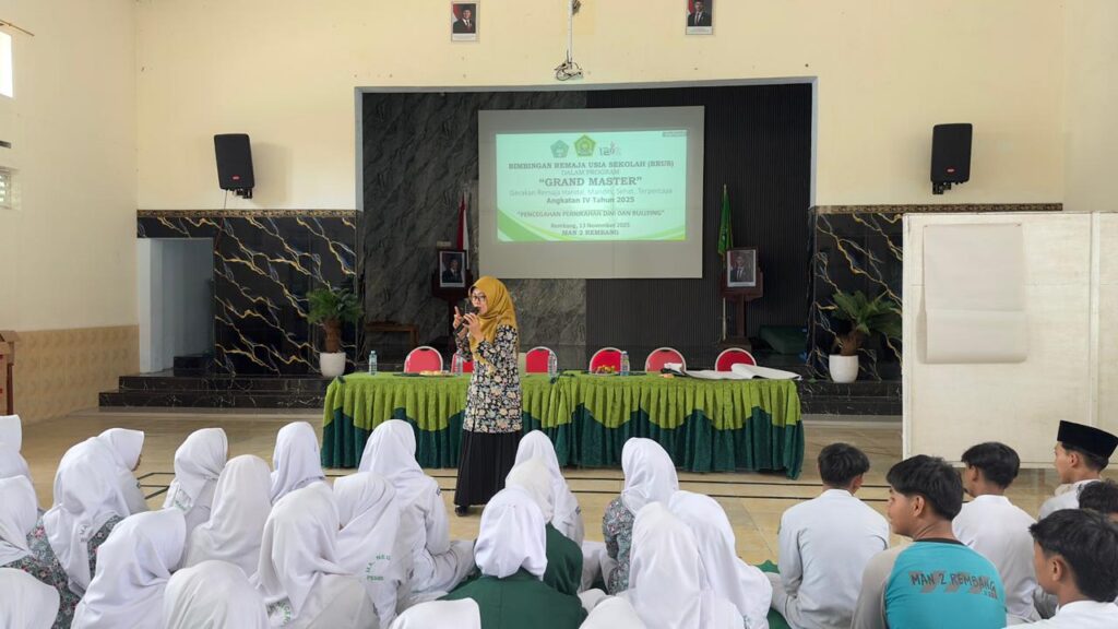 Lasem — Dalam upaya membentuk generasi muda yang tangguh, berkarakter, dan berakhlak mulia, MAN 2 Rembang menyelenggarakan kegiatan Bimbingan Remaja Usia Sekolah (BRUS) dalam program GRAND MASTER (Gerakan Remaja Handal, Mandiri, Sehat, Terpercaya) dengan tema “Pencegahan Pernikahan Dini dan Bullying”. Kegiatan ini berlangsung pada Kamis (13/11/2025) pukul 09.00–12.30 WIB di Aula MAN 2 Rembang.