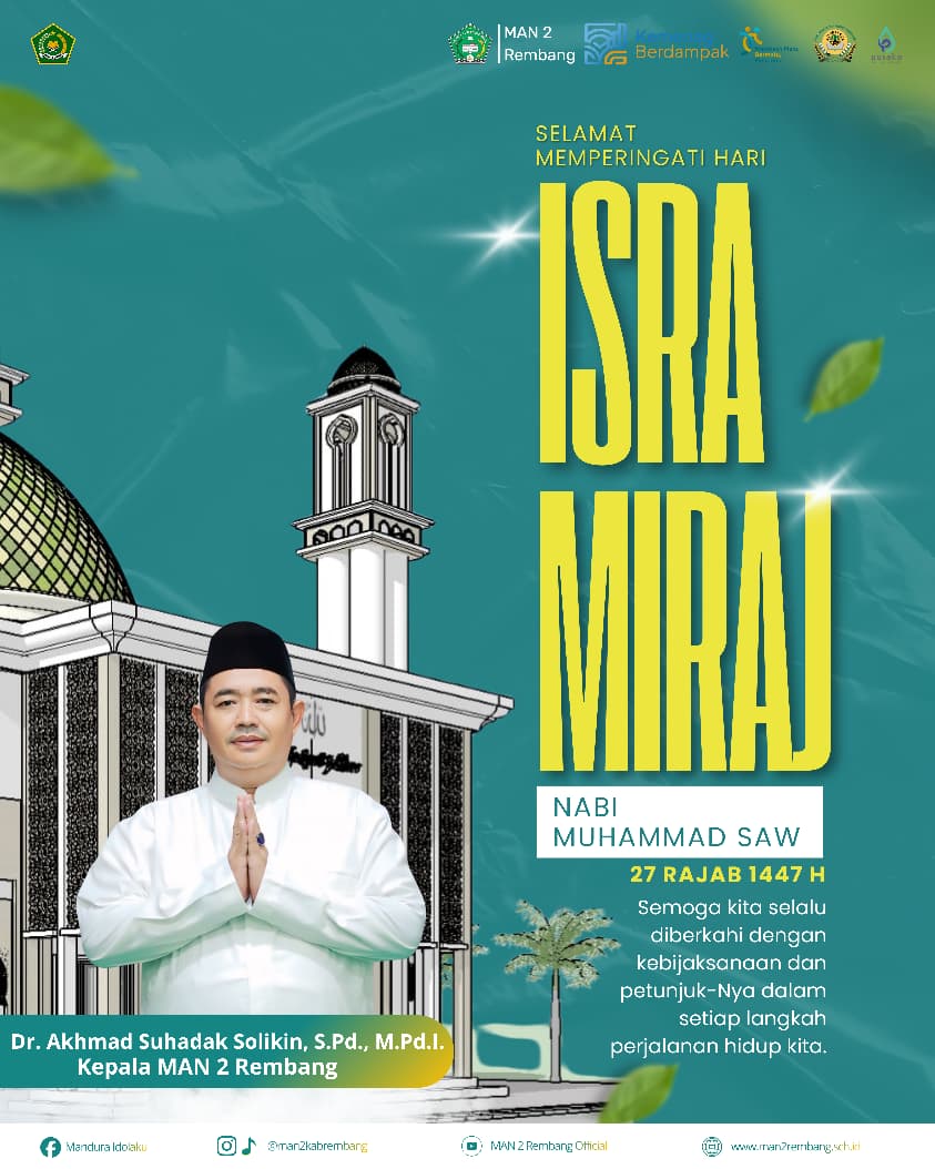 Dalam rangka memperingati Isra’ Mi’raj Nabi Muhammad SAW 1447 Hijriah, MAN 2 Rembang akan menyelenggarakan kegiatan keagamaan sebagai bentuk pembinaan iman dan takwa bagi seluruh warga madrasah.