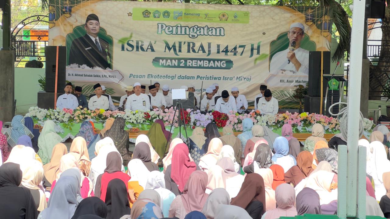 Lasem — MAN 2 Rembang menggelar Peringatan Isra Mikraj Nabi Muhammad SAW 1447 H di Hall Indoor MAN 2 Rembang pada Senin, 19 Januari 2026. Kegiatan yang dimulai pukul 08.30 WIB ini diikuti oleh seluruh civitas akademika MAN 2 Rembang dengan penuh khidmat. Peringatan kali ini mengusung tema “Pesan Ekoteologi dalam Peristiwa Isra Mikraj”.