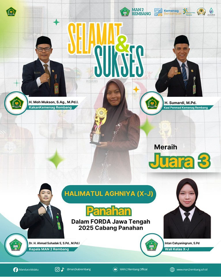 Selamat datang di Madrasah Aliyah Negeri 2 Rembang – Madrasah Hebat Bermartabat, Cerdas, Religius, dan Berprestasi